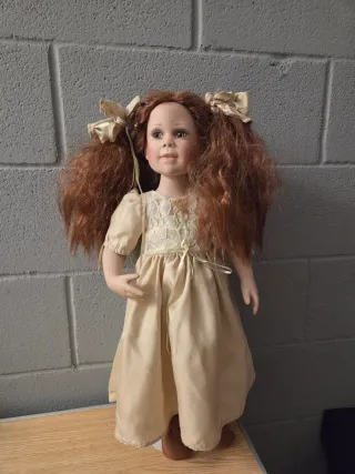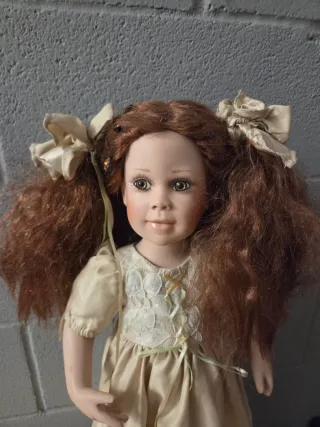 Preciosa muñeca de colección con detalles cuidados. - Cuerpo de porcelana. - Pelo largo y pelirrojo. - Vestido de tela color crema con encaje.