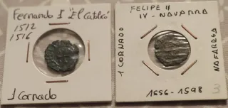 Dos cornados de diferentes épocas y reyes. - Cornado de Fernando I El Católico, años 1512 y 1516. - Cornado de Felipe II, IV de Navarra, años 1556-1598. -La de la imagen.