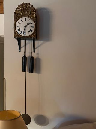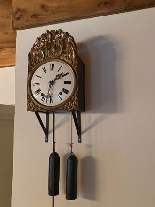 Precioso reloj de pared antiguo, ideal para coleccionistas. Su diseño clásico y ornamentado lo convierte en una pieza destacada. - Caja dorada con detalles. - Esfera con números romanos. - Incluye péndulo y pesas.