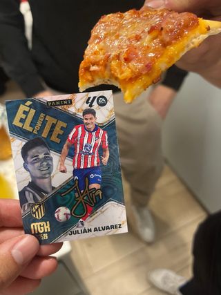 Carta de colección Panini Elite de Julián Álvarez. - Incluye firma dorada. - Diseño con detalles holográficos. - Muestra el escudo del club y el balón.