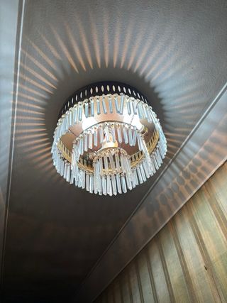 Elegante lámpara de araña de tamaño pequeño, con un diseño clásico y detalles en cristal. - Estructura metálica. - Cuelga de cristal.