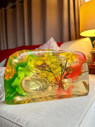 Interesante pieza decorativa de los años 70, de origen francés, elaborada en resina. 25cm de ancho - Contiene elementos marinos como dos peces, conchas y estrellas de mar. - Tonos verdes, amarillos y rojizos. #thebasquezahar