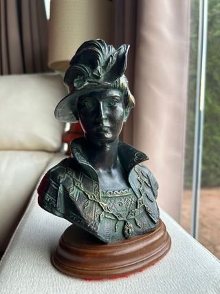 Inspirada en un busto de mujer en bronce, obra del escultor italiano Arnaldo Giannelli. El busto en venta representa a una mujer con un sombrero adornado con plumas y un atuendo detallado de estilo renacentista. La escultura presenta una pátina verde oscura envejecida, y está montada sobre una base de madera. NO ES DE BRONCE. Perfecto estado. 21cm de alto #thebasquezahar