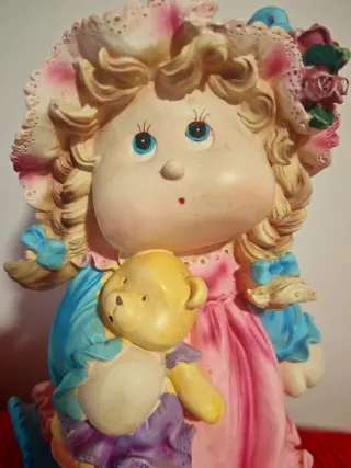 Original hucha con forma de muñeca estilo cuqui, ideal para decorar. - Diseño infantil con muñeca y osito. - Colores vivos: rosa, azul y detalles en morado. - Acabado brillante.