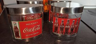 Conjunto de botes multiusos con diseño vintage de Coca-Cola. Ideales para almacenar o decorar. - Botes de cristal con tapa metálica. - Diseño clásico de Coca-Cola. Una tapa tiene un pequeño bollo. - Aptos para uso alimentario. Se entregan en Humanes Madrid y también se hace envío por la aplicación. Tengo más artículos de coleccionismo en mi perfil como se vé en las últimas fotos.