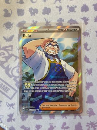 Carta de Entrenador Kofu del set stellar crown (SCRM 165/142). - Ilustración de Hideki Ishikawa. - Efecto: Roba 4 cartas si pones 2 cartas en la parte inferior de tu mazo. - Solo se puede jugar 1 carta de Entrenador por turno.