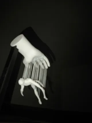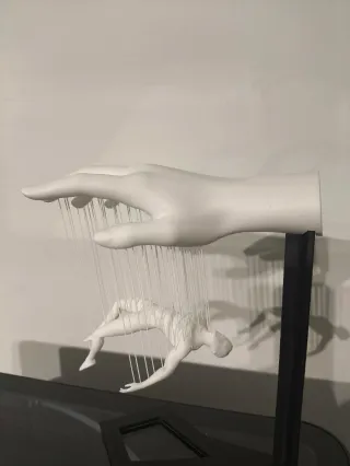 Escultura artística que representa una mano sosteniendo una figura humana con hilos. - Diseño abstracto y moderno. - Material: PTEG - Color: Blanco.