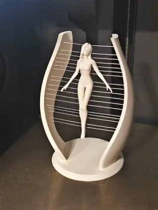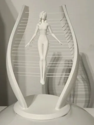 Elegante escultura de figura femenina en color blanco. Su diseño moderno y estilizado la convierte en una pieza decorativa única. - Base circular estable. - Estructura con líneas curvas. - Figura suspendida con hilos