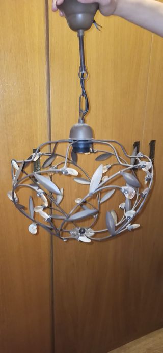Elegante lámpara antigua con un diseño inspirado en la naturaleza. - Estructura de metal con acabado en tonos marrones y plateados. - Adornada con hojas y detalles de cristal. - Ideal para añadir un toque de forja vintage a cualquier estancia. Se vende por cambio de decoración, muy poco uso está como nueva. Se entrega en Humanes de Madrid y también se hace envío por la aplicación. ALGO NEGOCIABLE. - Estructura de metal con acabado en tono marrón. - Adornos de cristal transparente. - Diseño floral y orgánico.