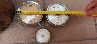 Conjunto de 3 relojes despertador de mesilla, ambos con un diseño antiguo y distintivo. - Reloj HERMON con MADE IN SPAIN grabado. - Reloj Blessing con manecillas verdes. Relojes despertador de mesilla muy antiguos para decoración, coleccionismo o restaurar. La cuerda funciona pero el resto no. Se entrega en Humanes de Madrid o se hace envío por la aplicación. ALGO NEGOCIABLE.