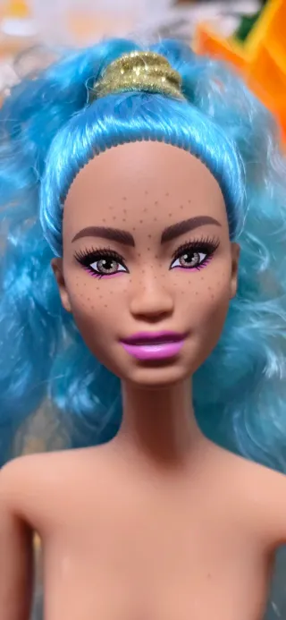 Muñeca Barbie Fashionistas del año 2014. - Pelo azul vibrante. - Maquillaje con sombras rosas y labios morados. - Pequeñas pecas en el rostro. - Adorno dorado en el pelo.MIRAR Y LEER TODAS LAS FOTOS.