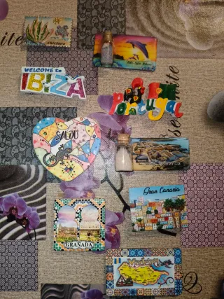 Conjunto de imanes decorativos con motivos de viajes y lugares. - Imanes de Ibiza, Salou, Granada, Gran Canaria y Madeira. - Incluye imanes con diseños de delfines, lagartos y paisajes. - Varios tamaños y estilos.