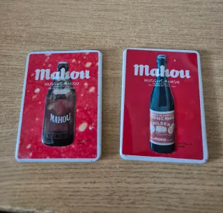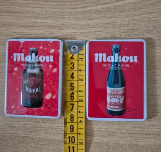 Set de dos imanes decorativos con la marca de cerveza Mahou. No envio No Negociable - Diseño inspirado en botellas antiguas de Mahou. - Uno de los imanes muestra la botella de 1940. - El otro imán muestra la botella de 1896.