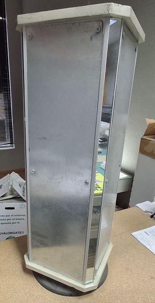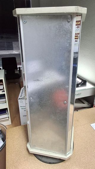 Expositor de sobremesa con base giratoria, ideal para exhibir imanes o pequeños objetos. Tiene cuatro caras de 20 cm. cada una y espejos en las esquinas. El alto del expositor es de 67 cm.