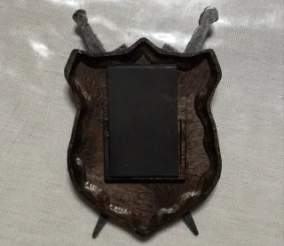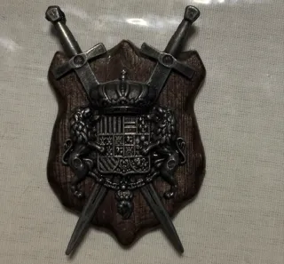 Imán decorativo para el frigorífico, con diseño de escudo. - Representa el escudo de los Reyes Católicos. - Incluye dos espadas cruzadas. - Detalle de corona y leones. - Base con textura de madera.