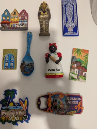 Colección de imanes de diferentes lugares del mundo. - Imán de un scooter italiano. - Imán de casas de Bruselas. - Imán de un sarcófago egipcio. - Imán de un diseño azul ornamental. - Imán de una puerta azul de Túnez. - Imán de una ventana azul. - Cuchara con diseño de Malta. - Figura de una mujer de Puerto Rico. - Imán de una casa en Honduras. - Imán de una máscara de Colombia. - Imán de Welcome to Bali. - Abrebotellas de Buenos Aires.