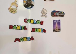 "Más de cien imanes para la nevera con forma de fichas de Scrabble, con las letras y también fichas de doble y triple puntuación. La forma más divertida de dejar mensajes, hacer la lista de la compra o presentar un regalo muy original. Ahora resulta difícil encontrarlo."
