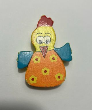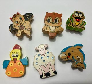 Se venden seis imanes infantiles de madera para nevera. Son coloridos y están pintados con motivos de animales. - Seis imanes en total. - Motivos: cerdito, búho, rana, diablo, cordero y delfín. - Piezas pequeñas y encantadoras.