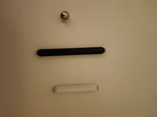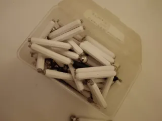 Conjunto de imanes cilíndricos blancos con tapas metálicas. - Material: plástico y metal. - Color: Blanco y plateado. - Forma: Cilíndrica y canica