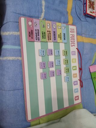 Tabla de actividades y recompensas con días de la semana. Incluye imanes para marcar el progreso. - Diseño colorido con actividades diarias. - Ideal para motivar a los niños.