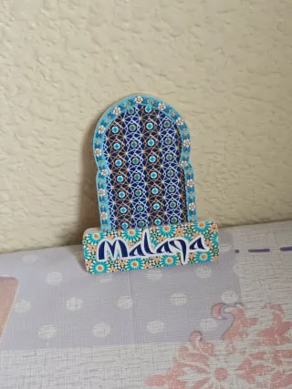 Imán de nevera con diseño inspirado en Málaga, hecho de cerámica. Forma de arco con motivos geométricos y florales. Medidas: 8 cm de largo. Nuevo, en perfecto estado.