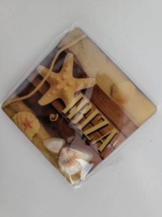 Imán decorativo con diseño de Ibiza. - Motivo de conchas marinas y estrella de mar. -2 conchas reales bañadas en resina Medidas: 5,8x5,8cm