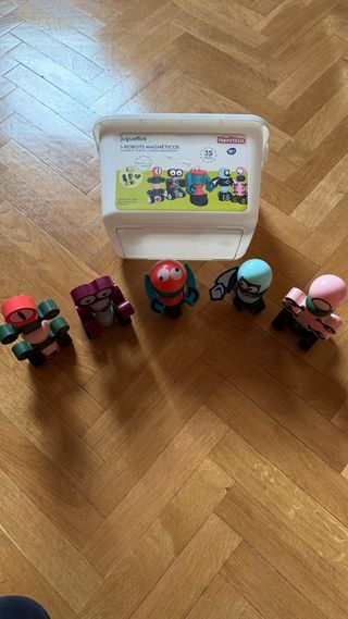 Set de 5 robots magnéticos para construir y jugar. Incluye piezas de diferentes colores y formas para crear múltiples combinaciones. - Robots magnéticos. - Piezas de madera y plástico. - Incluye contenedor de almacenamiento.
