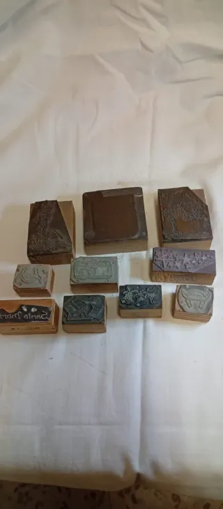 PEQUEÑAS A 5€ HAY 4 MEDIAS A 6€ UNIDAD HAY 4 MEDIANAS A 7€ UNIDAD HAY 4 NACIMIENTO MEDIANO 9€ LA DEL NACIMIENTO GRANDE 12€ Conjunto de antiguas piezas de imprenta, ideales para coleccionistas o amantes de la tipografía. - Piezas de metal y cobre con grabados detallados. - Diseños variados que incluyen figuras, edificios y elementos ornamentales. - Muestran el arte de la impresión tradicional.
