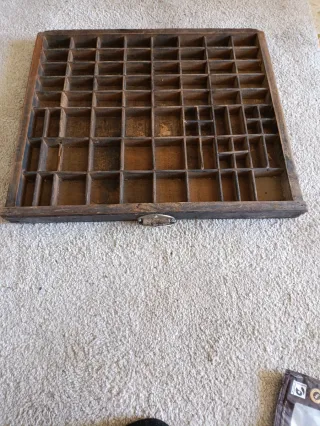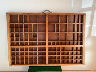 Este es un cajón de imprenta antiguo, fabricado en madera. Presenta múltiples compartimentos de diferentes tamaños, ideal para organizar objetos pequeños o como elemento decorativo. - Material: Madera. - Diseño: Múltiples divisiones internas. - Estilo: Rústico y vintage.
