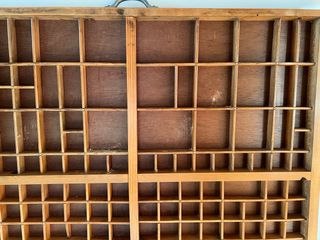 Cajones de imprenta antiguos, fabricados en madera. Ideal para decoración o almacenamiento. Múltiples compartimentos variados. Destinados originalmente para tipos de letra.. tipografía. Uno tiene puntos picados. Medidas: ancho 48, fondo 43, grosor 4