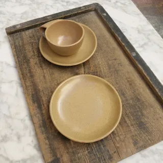 Cliche antiguo de imprenta con diseño de taza de café humeante, azucarero y cubiertos. - Material: Metal. - Diseño detallado.
