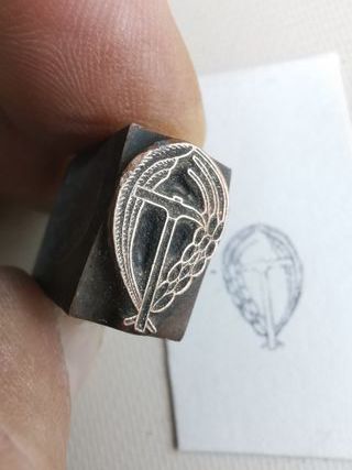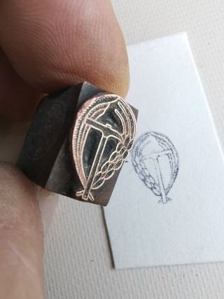 INSIGNIA CENTRAL NACIONAL SINDICALISTA (CNS).MARTILLO RODEADO DE RAMA DE TRIGO Y PALMA SE HA REALIZADO UNA PRUEBA SIMPLE DE MARCAJE EN PAPEL CON TINTA DE TAMPON SIN NINGUN RIGOR ARTISTICO PROFESIONAL Y LOS RESULTADOS SON SUBJETIVOS chibalete- cliché -imprenta,- tipos- tipográficos -letras -sello-plancha antigüedad- artes gráficas -litografía -óleo- medalla- grabado- daguerrotipo- lienzo