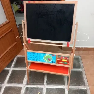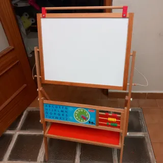 Pizarra de madera para niños con doble cara, ideal para aprender y jugar. - Pizarra negra para tiza. - Pizarra blanca para rotulador. - Incluye abecedario y números. - Reloj de aprendizaje. - Pizarra de madera con estante.