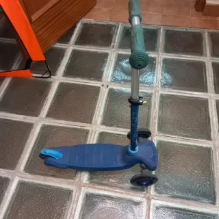 Patinete infantil para niños desde 4 años, ruedas medianas luminosas, se adapta con varias alturas, se pliega el manillar y se dobla completamente para ocupar menos espacio, la base donde apoyan los pies es textura lija para evitar escurrirse. Muy poco uso, tiene agrietadas las partes de plástico del extremo del manillar ( se muestra en la foto) lo que no afecta para nada al uso.