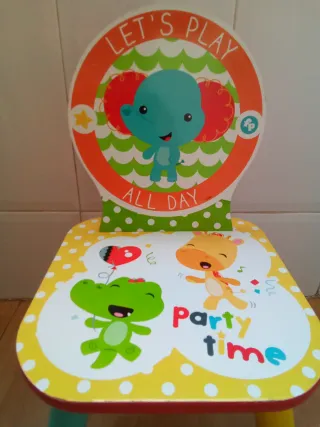 Silla infantil de madera con un divertido diseño de animales. - Alto 52 cm, Ancho 26,6 cm y Largo 26 cm. - Alto sin respaldo 26 cm. - Ilustraciones de elefante, cocodrilo y jirafa. - Tiene algunos roces por el uso. #sillainfantil,#sillademadera,#niño,#niña,#ilustracionesdeanimales.