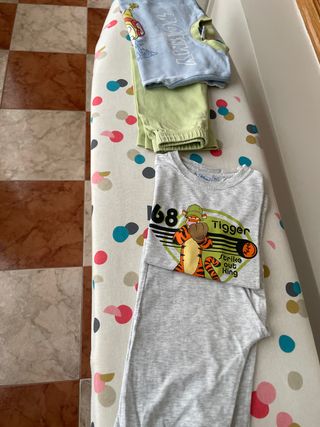 Conjuntos de pijamas para niño. - Camiseta azul con dibujo de Winnie the Pooh y texto POOHNY. - Pantalón verde. - Camiseta gris con dibujo de Tigger y texto Tigger Strike Out King. Marca Disney - Pantalón gris.