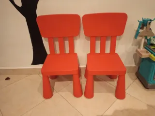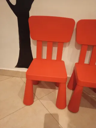 Conjunto de dos sillas infantiles de plástico en color rojo, perfectas para que los más pequeños tengan su propio espacio. - Diseño moderno y resistente. - Ideales para interiores o exteriores.