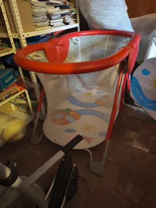Carrito de bebé infantil con un alegre diseño de corazones en tonos rosas y morados. Perfecto para jugar. Compuesto por capazo, sillita y maxicosi. Asa apoyamos rexlinable. Está en bastante buen estado. - Estructura metálica. - Asiento acolchado con estampado de corazones. - Capota negra. - Ruedas para facilitar el movimiento.