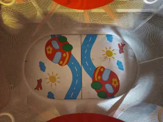Parque infantil con estructura de metal y malla. - Borde superior acolchado en color rojo. - Base con estampado de nubes y soles.