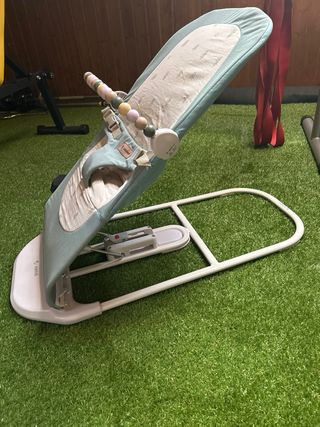 Hamaca Jane Baluu con un diseño moderno y confortable. - Tejido suave con estampado floral. - Barra de juegos con cuentas de madera. - Arnés de seguridad de 3 puntos. - Base estable. - 3 posiciones de reclinado. - Desenfunfable para poder lavar.