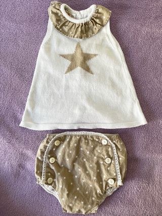 Conjunto de dos piezas para bebé de 3 meses, ideal para cualquier ocasión. - Camiseta de hilo blanco sin mangas con cuello volante y estrella dorada. - Bombacho a juego con estampado de estrellas blancas y botones decorativos. -Marca Pecesa