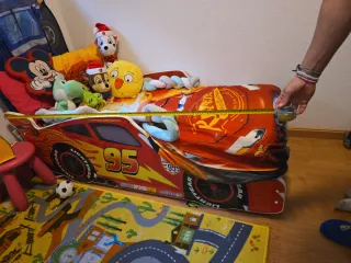 Cama infantil con diseño del coche Rayo McQueen de Cars. Ideal para los más pequeños. - Diseño inspirado en el personaje de Disney Pixar. - Estructura resistente. -1,50cm de largo y 75cm de ancho y 47 cm de alto -dos veces usada , se regala colchon de mas debido que al que venía era muy fino.