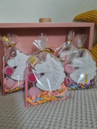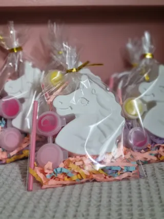 Kit de manualidad infantil con figura de unicornio para pintar. Incluye todo lo necesario para una actividad creativa. - Figura de unicornio en material blanco. - Pincel. - Pinturas de colores variados.