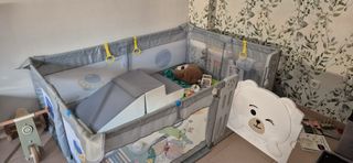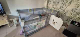 Parque de juegos y corralito para bebés y niños pequeños. Ideal para crear un espacio seguro y divertido. - Diseño en color gris. - Incluye asas para facilitar el agarre. - Panel frontal con diseño de oso. - Colchoneta interior con dibujos infantiles.