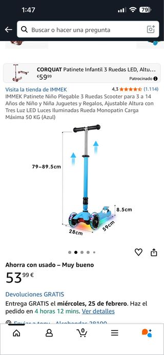 Patinete infantil de tres ruedas en color azul, con luces LED en las ruedas. Es plegable y tiene altura ajustable. - Luces LED en las ruedas. - Altura ajustable. - Plegable. Color: rosa