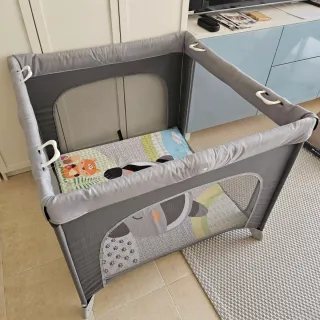 Parque infantil de fáacil y rápidi montaje. Recogido no ocupa casi espacio. Tiene dos pequeños agujeros en la tela de la purtecita. La bañerita tiene termometro digital, y viene con un colchoncito de floracion para mayor seguridad.. Tapon para vaciado rápido.