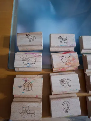 Lote de 20 sellos de madera con dibujos infantiles. - Diseños variados: animales, objetos, personajes, coches, casa, flores, globos, corazones y caramelos. - Ideales para manualidades y juegos. - Material: madera.