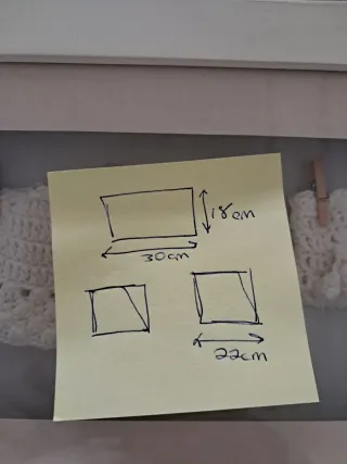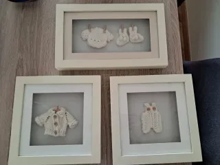 Conjunto de tres cuadros decorativos para habitación infantil. Cada cuadro presenta una prenda de ropa tejida a mano, como un jersey, un conjunto de polainas y un mono. - Diseños delicados y artesanales. - Marcos de madera en color neutro.