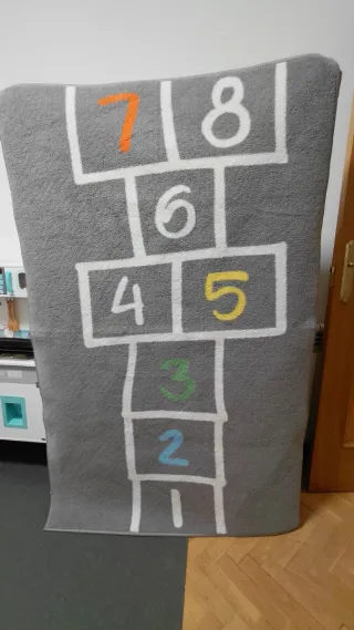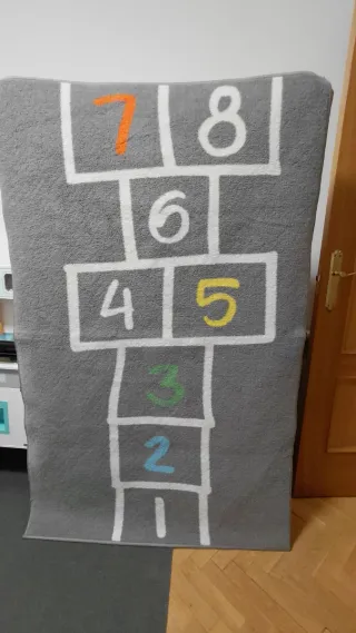 Alfombra de juego con diseño de rayuela para niños. En buenas condiciones la cara del rizo y la goma antideslizante. - Diseño de rayuela con números. - Ideal para habitaciones infantiles.