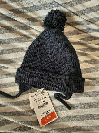 Gorro de punto azul para bebé o niño pequeño, con pompón en la parte superior y orejeras con cordones. - Talla: 3-5 años. - Color: Azul marino. - Material: Tejido de punto. - Cierre: Cordones.